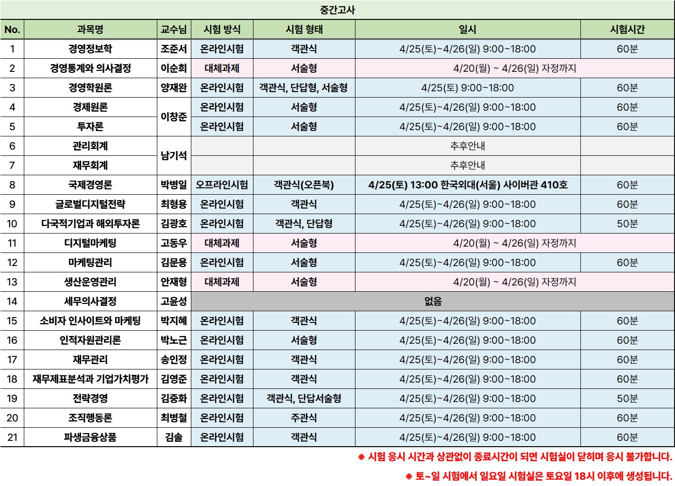 *과목별 담당 교수님의 허가 후 시험 응시 가능하며, 감점이 있을 수 있는 점 참고바랍니다.